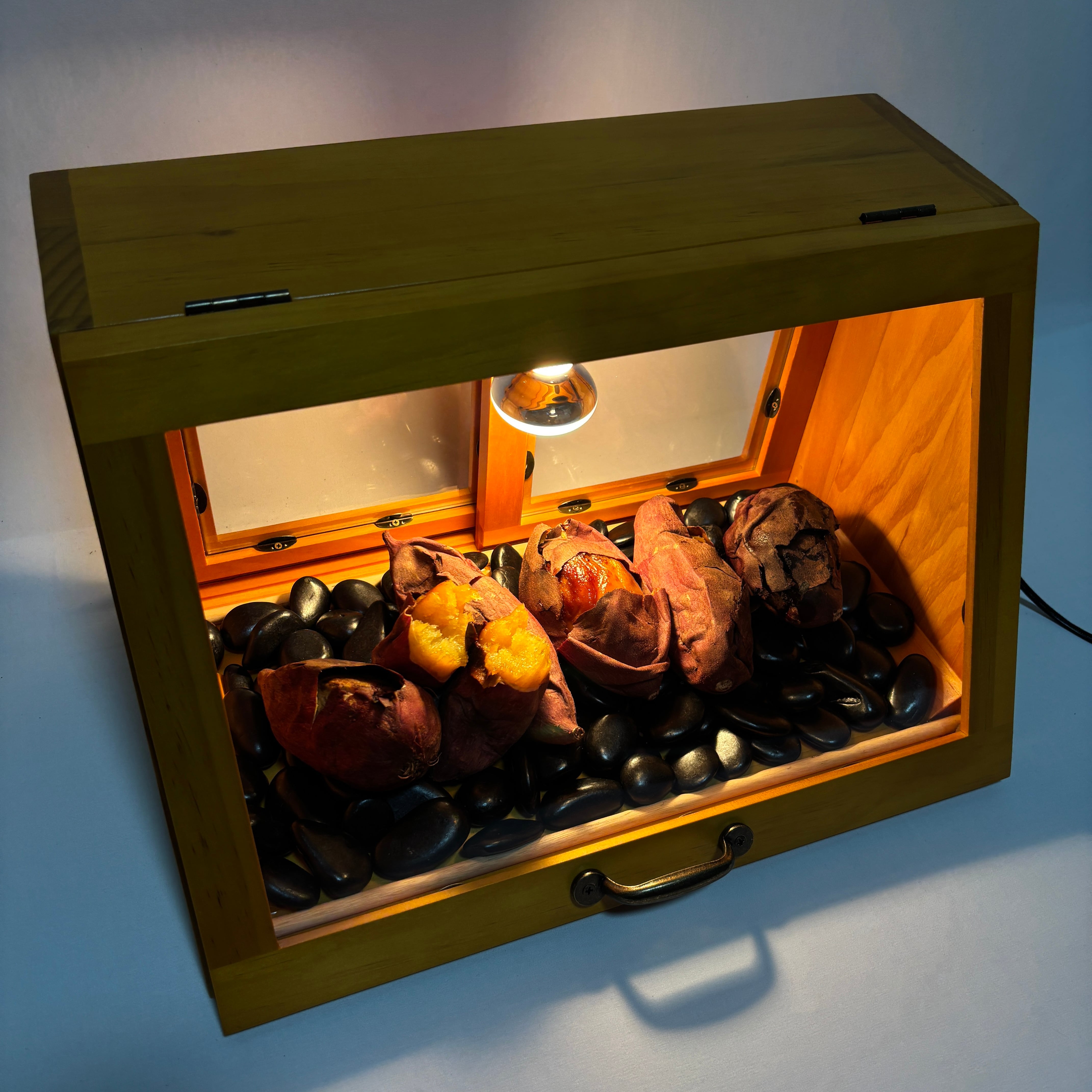 ナチュラルな木枠とガラスケースが、焼き芋やパンを“見せる保温ケース”として引き立て、マルシェやキッチンカー、カフェカウンターをぐっと華やかにしてくれます。
